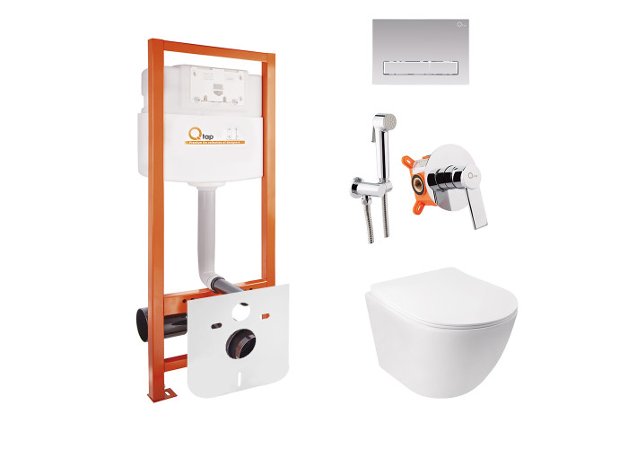 Унітаз з сидінням: Qtap Jay QT07335176W. Інсталяція з панеллю змиву: Qtap Nest QTNESTM425M08CRM. Набір для гігієнічного душу зі змішувачем: Qtap Form QTFORMCRM001AB