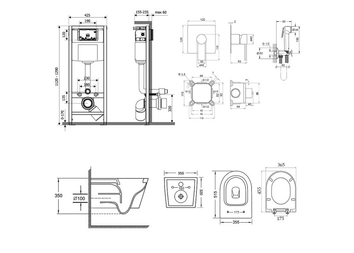 Унітаз, сидіння, інсталяція, панель змиву, звукоізоляційна прокладка, змішувач, лійка для гігієнічного душу, шлангове приєднання, душовий шланг, кріпильні деталі.