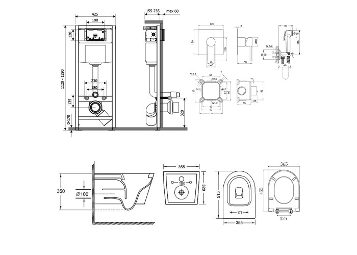 Габарити виробів (ВхШхД), мм Унітаз: 350х355х515. Сидіння: 35х365х455. Інсталяція: 1110х425х145. Панель змиву: 150х220х23