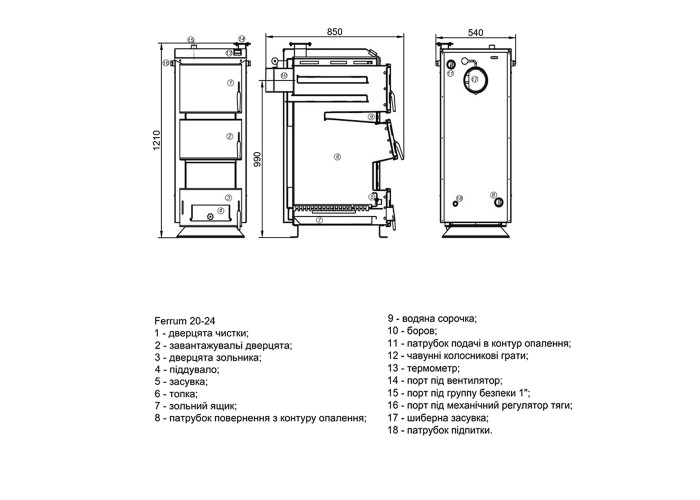 Котел твердопаливний Thermo Alliance Ferrum FSF 20-24 V2.0 — сучасний водогрійний прилад для обігріву житлових, промислових та інших будівель. Сталевий корпус обшитий теплоізоляцією з мінеральної вати товщиною 40 мм. Котел працює на таких видах палива: дрова, вугілля кам’яне, відходи деревини, тирсові й торф’яні брикети, кусковий торф. Бік відкривання дверцят універсальний, їх можна перевішувати. Обладнаний портом під пелетний пальник.