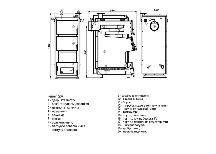 Котел твердопаливний Thermo Alliance Ferrum+ FSF+ 20 V2.0 забезпечить теплом приміщення площею до 200 кв.м. Пристрій призначений для роботи в автономній опалювальній системі. Завантаження дров, кам‘яного вугілля, брикет необхідно виконувати вручну. Колосники чавунні, стінки сталевого корпусу подвійні, між ними — водяна сорочка. Під декоративною обшивкою — шар ізоляції з мінеральної вати товщиною 40 мм. Теплообмінник зроблений зі сталі (6 мм). Всі три дверці можна перевісити на інший бік.