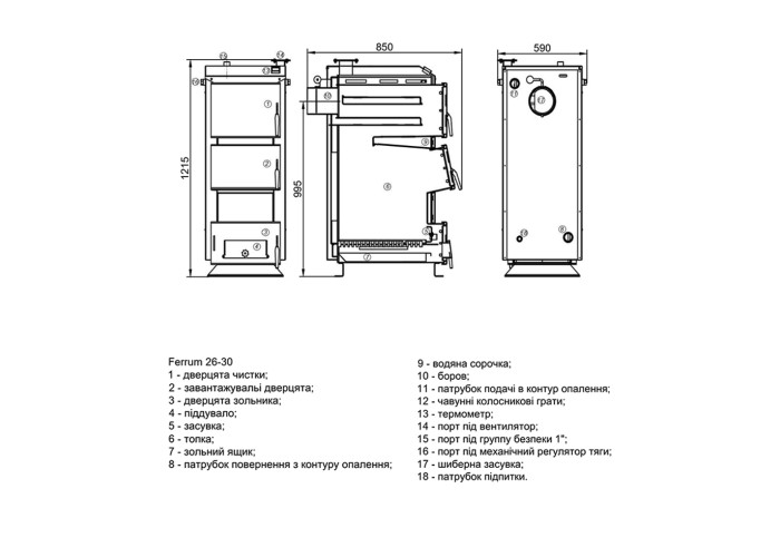 Котел твердопаливний Thermo Alliance Ferrum FSF 26-30 V2.0 забезпечить теплом в холодний період року приватний будинок або іншу споруду площею до 300 кв. м з автономною системою опалення. Високий ККД знижує витрати на паливо. Конструкція дозволяє перевішувати дверцята на інший бік, регулювати щільність їх прилягання. Колосники зроблені з чавуну, товщина сталі теплообмінника 4 мм. Передбачена можливість встановлення механічного регулятора тяги.