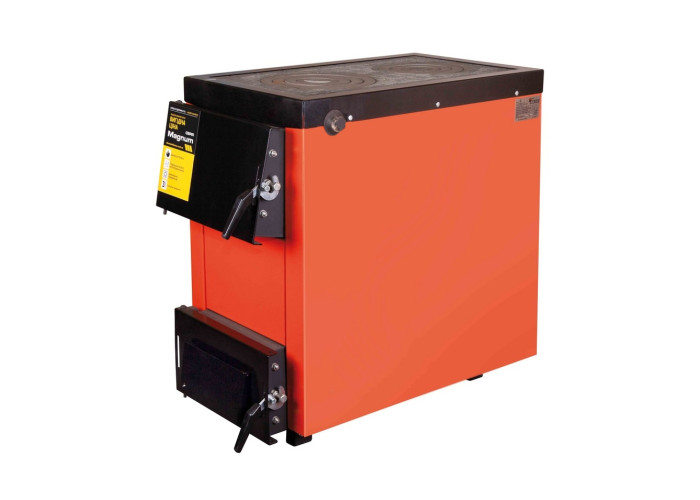 Котел твердопаливний Thermo Alliance Magnum SSF 20 з плитою розроблений для автономних водонаповнених опалювальних систем потужністю до 20 кВт. Це сталевий водогрійний пристрій з вбудованою варильною поверхнею на 2 конфорки. Колосники з чавуну, завантаження палива — ручне. Дверцята обслуговування котла можна регулювати, передбачена можливість зміни щільності прилягання, сторони відкривання. Стінки корпусу подвійні, між ними — водяна сорочка. Теплоізоляція стін зроблена з мінеральної вати.