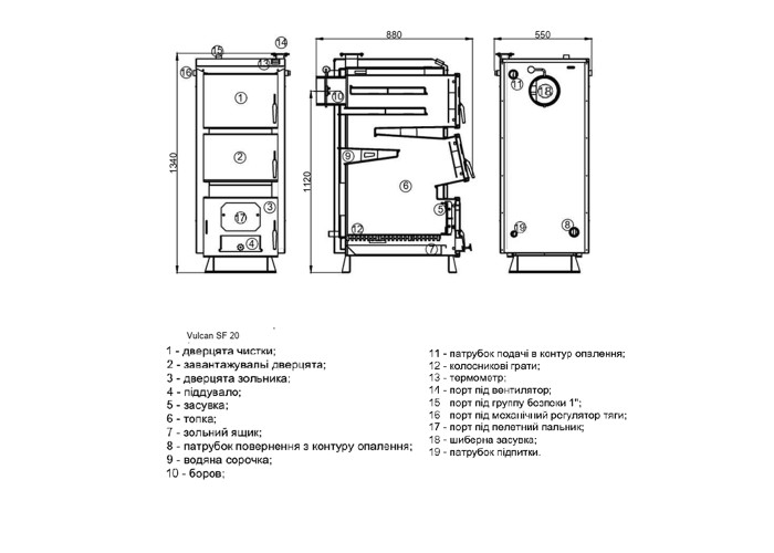 Котел твердопаливний Thermo Alliance Vulcan SF 20 V2.0 працює з високою ефективністю, його ККД — не нижче 85 %. Сталевий водогрійний пристрій забезпечить теплом автономну опалювальну систему, яка обігріває приміщення площею до 200 кв. м. Завантаження палива ручне, проте завдяки наявності порту під пелетний пальник котел може бути переобладнаний під автоподачу пелет. Колосники чавунні, теплообмінник зроблений зі сталі товщиною 6 мм.