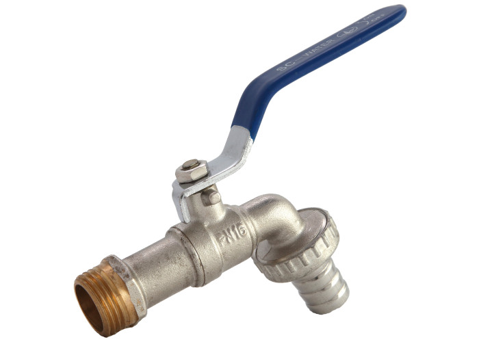 Латунний нікельований кран, що застосовується у якості запірної арматури на трубопроводах систем водопостачання (у тому числі питного) з робочою температурою до 75 º С і тиском до 10 бар. Наявність знімного штуцера з накидною гайкою дає можливість виробляти його заміну в залежності від діаметра і матеріалу застосовуваного шланга. Розсікач забезпечує формування компактного струменя виливу. Кран оснащений алюмінієвою рукояттю. Різьба приєднання - зовнішня. Неремонтопридатний. Мінімальний ресурс - 4 тис. циклів. Крани для поливу мають ще дві назви: кран зі штуцером і кран-пиво. Перша назва обумовлено наявністю виходу типу "йорж", друге, тому що кран врізається в ємність з водою. Відрізняються крани видом покриття (є нікель чи ні) і типом латуні (найкращий варіант марка CW617N).