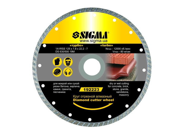 Круг відрізний алмазний "Турбо" Ø110х1.8х22.2 мм, 12000 об/хв Sigma (1922211) призначений для мокрого різання будівельних матеріалів великих розмірів. Купити круг відрізний Sigma Ви можете, оформивши замовлення в нашому інтернет-магазині за допомогою простої форми, доставка здійснюється по всій Україні. Якщо у Вас виникли питання, Ви можете зателефонувати за вказаними номерами телефонів або замовити зворотний дзвінок. Фахівці нашого інтернет-магазину нададуть Вам докладні консультації та допоможуть зробити правильний вибір.