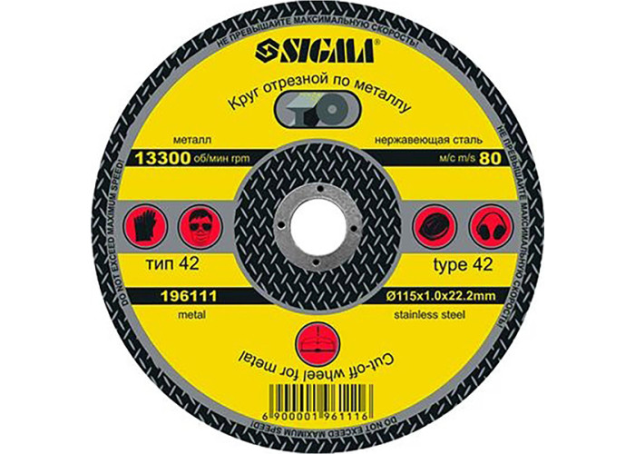 Круг відрізний по металу Ø115х2.5х22.2 мм, 13300 об/хв Sigma (1941261) призначений для різання виробів з металів і нержавіючої сталі, роботи з кузовною сталлю і іншими аналогічними матеріалами. Робочим інструментом при роботі відрізного кола є кутова шліфувальна машина (КШМ, болгарка). Переваги: відповідність найвищим європейським нормам безпеки і якості; висока ріжуча здатність і низька вартість одного різу - відмінне співвідношення ціни, якості, стійкості, продуктивності і надійності; рівномірний знос без викришування під час роботи при однаковій швидкості різання, оптимальна твердість; мінімізація нагріву робочої зони - підвищена зносостійкість; м'який різ - рівне різання матеріалу, поверхня круга не затупляется; відсутність задирок, припалів, вібрації - ідеальне балансування кола і посадочного кільця мінімізують вібрації під час роботи, що дозволяє отримати якісний різ.