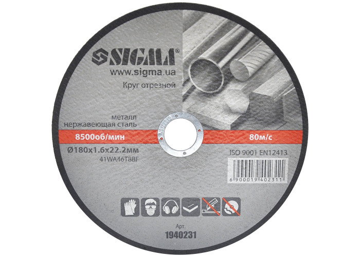 Круг відрізний по металу Ø180x1.6x22.2 мм, 8500 об/хв Sigma (1940231) призначений для різання виробів з металів і нержавіючої сталі, роботи з кузовною сталлю і іншими аналогічними матеріалами. Робочим інструментом при роботі відрізного кола є кутова шліфувальна машина (КШМ, "болгарка"). Переваги: відповідність найвищим європейським нормам безпеки і якості; висока ріжуча здатність і низька вартість одного різу; рівномірний знос без викришування під час роботи при однаковій швидкої швидкості різання, оптимальна твердість; мінімізація нагріву робочої зони - підвищена зносостійкість; м'який зріз - рівне різання матеріалу, поверхня круга не затупляется; відсутність задирок, припалів, вібрації - ідеальне балансування кола і посадочного кільця мінімізують вібрації під час роботи, що дозволяє отримати якісний зріз.