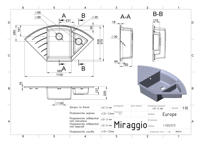 Кутова кухонна мийка Europe представлена ​​в 6 кольорах: білий, жасмин, пісочний, терра, сірий і чорний. Замовляючи кухонну мийку в інтернет-магазині сантехніки Miraggio ви отримуєте гарантію 10 років, 90 днів на обмін товару, а так само безкоштовну доставку.