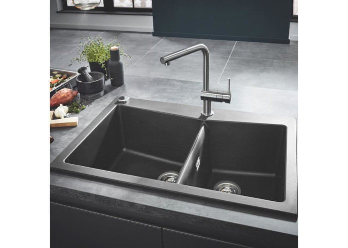 Кухонна мийка Grohe Sink K700 31657AT0 виготовлена з кварцового композиту, який складається з 80% кварцу та 20% акрилової смоли й затверджувача. Завдяки системі GROHE QuickFix установлення мийки не візьме багато часу та не потребує додаткового обладнання. Мийка виконана з двома чашами з низькою перегородкою та мінімалістичним переливом. Ізоляція GROHE Whisper на нижній частині мийки зменшує шум, а обробка Granite Grey не реагує на ультрафіолетове випромінювання.