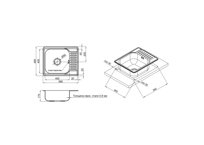 Мийка, сифон, зливник/перелив, кошиковий вентиль, ущільнювальна стрічка.