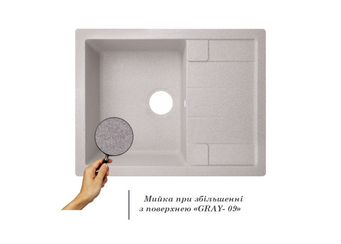 Кухонна мийка Lidz (GRA-09) 650x500/200 виготовлена з якісного штучного каменю, має сіру матову поверхню, тому буде чудово виглядати зі змішувачем того ж кольору. Відмінна якість та дизайн мийки задовольнять найвибагливі вимоги. Вона виконана з робочою чашею з отвором злив-перелив і ребристим крилом для сушіння посуду або розморожування продуктів. Кухонна мийка монтується урізним способом в отвір в стільниці.