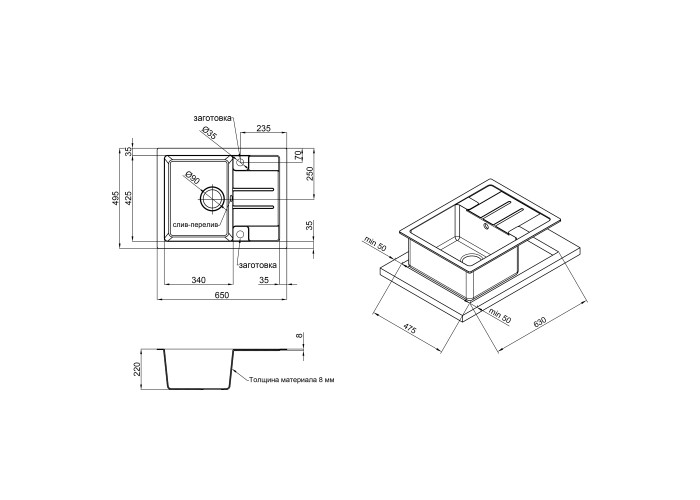 Мийка, сифон, слив/перелив, кошиковий вентиль.