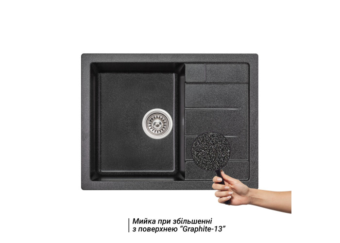 Кухонна мийка Lidz 650x500/200 GRF-13 (LIDZGRF13650500200) виготовлена з якісного штучного каменю, має графітову матову поверхню, тому буде чудово виглядати зі змішувачем того ж кольору. Відмінна якість та дизайн мийки задовольнять найвибагливі вимоги. Вона виконана з робочою чашею з отвором злив-перелив і ребристим крилом для сушіння посуду або розморожування продуктів. Кухонна мийка монтується урізним способом в отвір в стільниці.