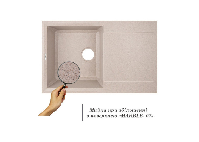 Кухонна мийка Lidz (MAR-07) 790x495/230 виготовлена з якісного штучного каменю, має пісочну матову поверхню, тому буде чудово виглядати зі змішувачем того ж кольору. Відмінна якість та дизайн мийки задовольнять найвибагливі вимоги. Форма мийки прямокутна з гострими кутами. Виріб виконано з робочою чашею з отвором злив-перелив і втиснутим для стікання води плавким крилом для сушіння посуду або розморожування продуктів.