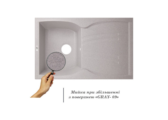 Кухонна мийка Lidz (GRA-09) 790x500/200 виготовлена з якісного штучного каменю, має сіру матову поверхню, тому буде чудово виглядати зі змішувачем того ж кольору. Відмінна якість та дизайн мийки задовольнять найвибагливі вимоги. Форма мийки прямокутна з гострими кутами. Виріб виконано з робочою чашею з отвором злив-перелив і втиснутим для стікання води ребристим крилом для сушіння посуду або розморожування продуктів.