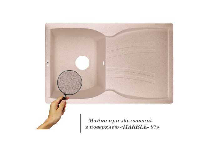 Кухонна мийка Lidz (MAR-07) 790x500/200 виготовлена з якісного штучного каменю, має пісочну матову поверхню, тому буде чудово виглядати зі змішувачем того ж кольору. Відмінна якість та дизайн мийки задовольнять найвибагливі вимоги. Форма мийки прямокутна з гострими кутами. Виріб виконано з робочою чашею з отвором злив-перелив і втиснутим для стікання води ребристим крилом для сушіння посуду або розморожування продуктів.