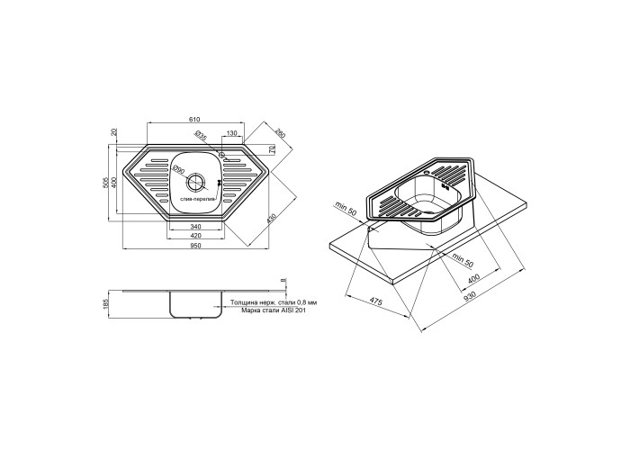 Кухонна мийка Lidz 9550-D Decor 0,8 мм (LIDZ9550DEC08) виготовлена з нержавіючої сталі харчової марки, тому виріб прослужить довгі роки. Також варто відзначити винятковий дизайн, який прикрасить будь-яку кухню. Відмінна якість та дизайн мийки задовольнять найвибагливі побажання! Мийка виконана з двома ребристими крилами для сушіння посуду або розморожування продуктів, отвором для змішувача. Монтується урізним способом в отвір в стільниці.