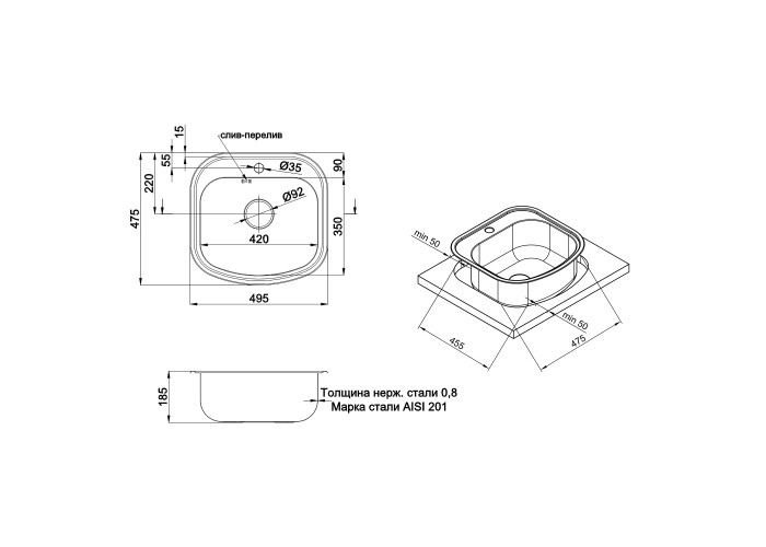 Кухонна мийка Qtap 4947 Satin 0,8 мм (QT4947SAT08)
