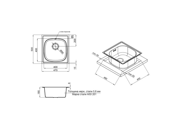 Кухонна мийка Qtap 5047 Satin 0,8 мм (QT5047SAT08)