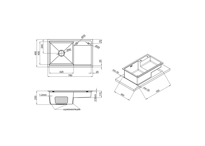 Мийка, сифон, зливник/перелив, кошиковий вентиль, кріплення.