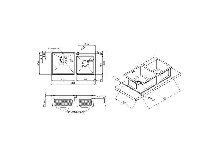 Мийка, сифон, зливник/перелив, кошиковий вентиль, кріплення.