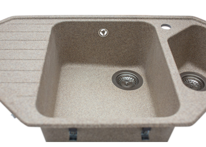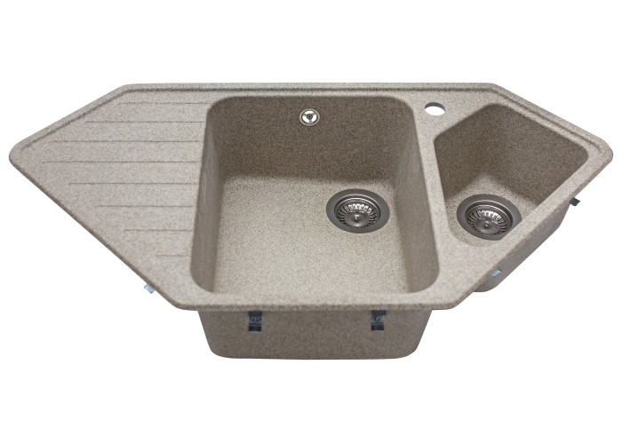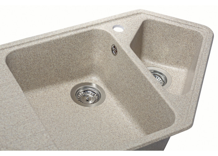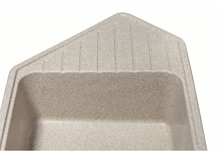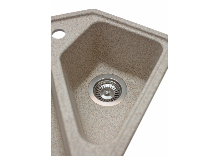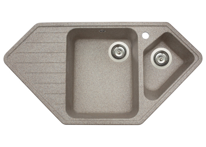 Кухонна мийка з кварцевого піску Tirion призначена для розміщення в кутку кухні. Мийка має центральну містку чашу та одну невелику додаткову, в якій ви можете мити фрукти, столові прилади. Так само мийка має зручне крило для посуду.