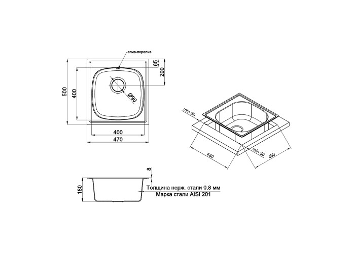 Мийка, сифон, зливник/перелив, кошиковий вентиль, ущільнювальна стрічка.