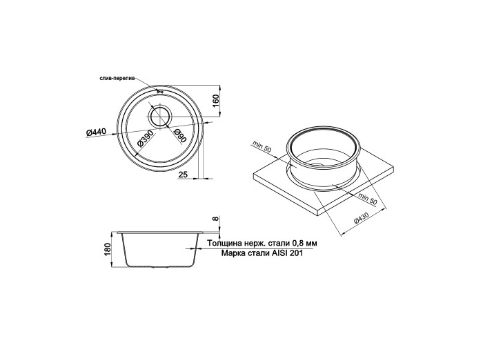 Мийка, сифон, зливник/перелив, кошиковий вентиль, ущільнювальна стрічка.