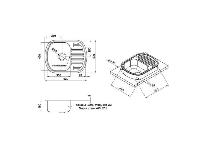 Мийка, сифон, зливник/перелив, кошиковий вентиль, ущільнювальна стрічка.