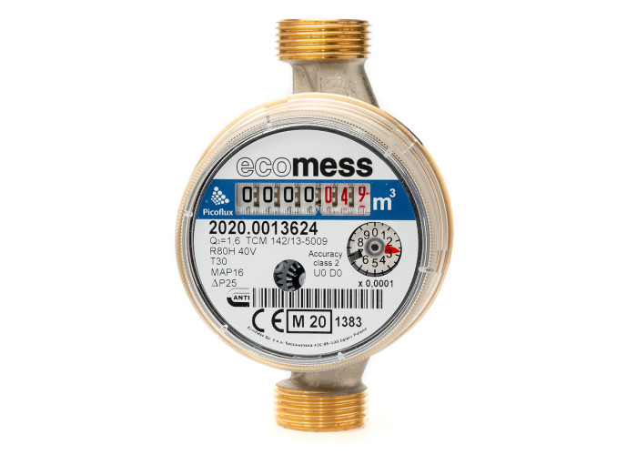 Квартирні лічильники торгової марки Ecomess для холодної і гарячої води призначені для вимірювання об'єму чистої холодної та гарячої води, яка протікає по напірному трубопроводу. Максимальні температури: 30ºС (для холодної води) та 90ºС (для гарячої води). Надійність і довговічність лічильника холодної та гарячої води забезпечується 18 річним досвідом Ecomess Sp. z.o.o. Вісь, на яку, одягнена крильчатка водоміра, виготовлена з нержавіючої сталі і обертається в двох сапфірових підшипниках. Обертання крильчатки передається рахунковому механізму через муфту, яка скорочує час спрацьовування лічильника при низьких витратах. Корпус лічильника холодної та гарячої води виготовляється з корозійностійкої латуні методом штампування, який гарантує відсутність пустот і неоднорідностей, які можуть привести до руйнування корпусу. Захистом від впливу зовнішнього середовища на корпус служить нікелеве покриття. Водоміри торгової марки Ecomess мають польський гігієнічний сертифікат BK / W / 0212/01/2018. Переваги: Повністю поворотний і герметичний механізм. Латунний нікельований корпус. Антимагнітний захист. Сапфіровий підшипник крильчатки. Система самоочищення ротора підшипника. Внутрішня система регулювання. Гладке дно вимірювальної камери для запобігання забрудненню. Основні дані: Без штуцерів. Довжина – 110 мм. Міжповірочний інтервал – 4 роки.