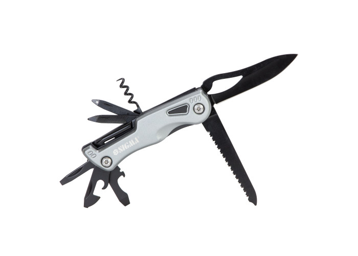 Мультиінструмент ніж 12в1 (чохол) Sigma (4375521) виготовлений на базі повноцінного ножа і виконаний з високоякісної нержавіючої сталі 3Cr13 (твердість 57 HRC), містить мінімальний набір необхідних інструментів. Ніж зручно лежить в руці, завдяки ергономічній формі рукоятки. Кріпильне кільце дозволяє кріпити ніж до одягу або спорядження. Інструмент виконаний з легованої сталі 2Cr13 (твердість 54 HRC). Переваги: конструкція з нержавіючої сталі; чорнене покриття робочих частин; ергономічна анодована алюмінієва рукоятка; чохол з можливістю підвісу до поясу; ідеальний інструмент для щоденного використання. 12 предметів: підвіс; відкривачка для пляшок; плоска викрутка SL6; великий ніж; викрутка PH1; штопор; пила по дереву; консервний ніж; викрутка плоска міні SL3; пилка; пушер; ліхтарик (харчування здійснюється двома елементами класу Lithium cell cr1616 3V sc (в комплект не входять). Купити мультиінструмент Sigma Ви можете, оформивши замовлення в нашому інтернет-магазині за допомогою простої форми, доставка здійс