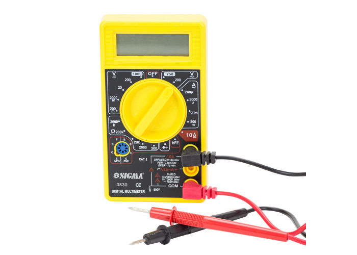 Мультиметр цифровий Sigma (4008571) універсальний призначений для вимірювання змінногї і постійногї напруги, змінного струму, опіру ланцюга, виконання тестування на провідність і перевірки діодів. Особливості: LCD дисплей, розмір цифр ½", макс.читання 1999 відліків; постійна напруга: 200mV/2000mV/20V/200V/1000V; змінну напругу: 200V/750V; постійний струм: 200μA/2000μA/20mA/200mA/10A; опір : 200/2000/20К/200К/2000КΩ; перевірка діодів: тест стан 3V/0.8mA; захист від перевантаження; розміри: 126х70х26 мм; Вага: 98 г. Купити мультиметр Sigma Ви можете, оформивши замовлення в нашому інтернет-магазині за допомогою простої форми , доставка здійснюється по всій Україні. Якщо у Вас виникли питання, Ви можете зателефонувати за вказаними номерами телефонів або замовити зворотний дзвінок. Фахівці на його інтернет-магазину нададуть Вам докладні консультації та допоможуть зробити правильний вибір.