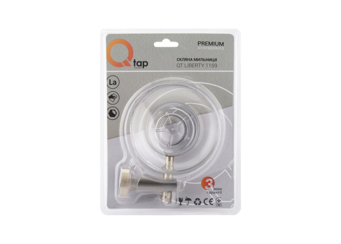 Мильниця Qtap Liberty ANT 1159 надійно кріпиться до стіни, складається з тримача та скляної чаші. Виріб не піддається корозії. Мильниця знімна, завдяки чому догляд за нею буде простим і легким. У виробі використовується кільце ущільнювача (прокладка), необхідне для щільного з‘єднання металу і скла, які також перешкоджають виникненню шуму в результаті зіткнення частин виробу. На тримач нанесено фірмовий логотип компанії.