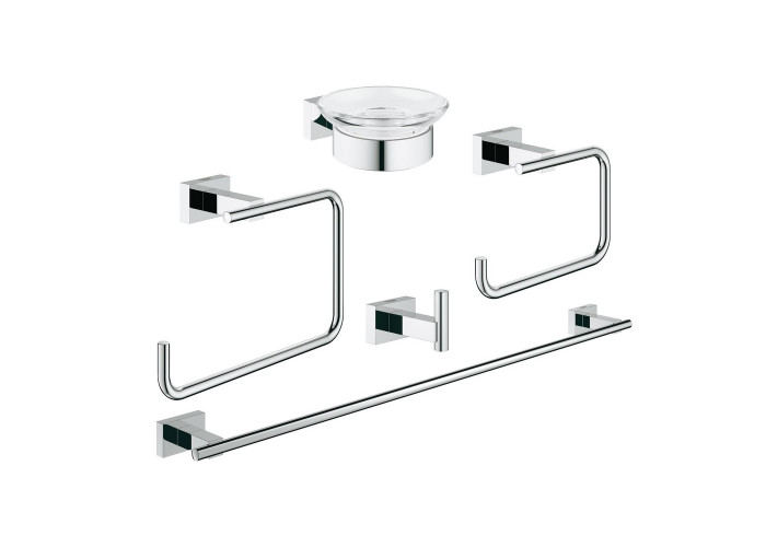 Набір аксесуарів Grohe Essentials Cube 40758001 додасть чітку кубічну рису до ванної кімнати. Набір об‘єднує в собі заключні елементи для зручності, складається з мильниці з тримачем (40754001), тримача для рушника у вигляді перекладини (40509001), тримача туалетного паперу (40507001), гачка для одягу (40511001), тримача для рушника у вигляді кільця (40510001). Кожна деталь покрита міцним і легким у догляді хромованим покриттям Grohe StarLight.