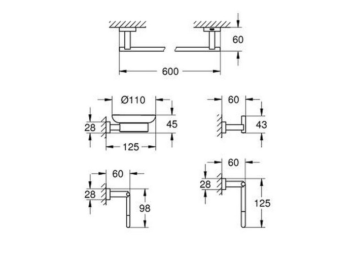 Мильниця з тримачем (40754001), тримач для рушника у вигляді перекладини (40509001), тримач туалетного паперу (40507001), гачок для одягу (40511001), тримач для рушника у вигляді кільця (40510001), кріплення, інструкція.