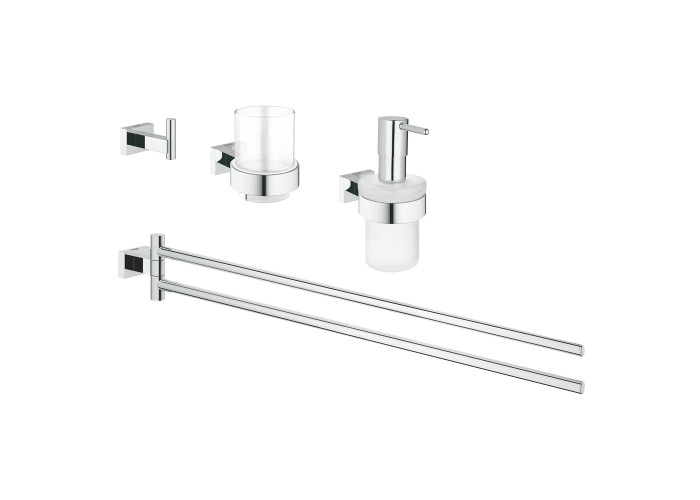 Набір аксесуарів Grohe Essentials Cube 40847001 - це особлива риса оформлення вашої ванної кімнати. Набір аксесуарів об‘єднує в собі важливі для зручності елементи: дозатор рідкого мила (40756001), склянку з тримачем (40755001), тримач для рушника (40624001), гачок для одягу (40511001). Міцне хромоване покриття Grohe StarLight дозволить продовжити термін експлуатації аксесуарів.