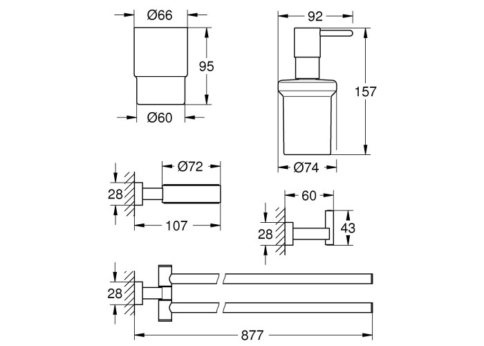 Дозатор рідкого мила (40756001), склянка з тримачем (40755001), тримач для рушника (40624001), гачок для одягу (40511001), кріплення, інструкція.