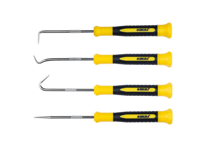 Набір гачків для слюсарних робіт 4шт Sigma (4003411) - для демонтажу манжетів, сальників і кілець ущільнювачів малих розмірів вузлів і агрегатів автомобільної техніки, розташованих в важкодоступних місцях. Характеристики вуглецева сталь 45; двокомпонентна рукоятка. 4 предмета: шило; гак; гак 45º; гак 90º.