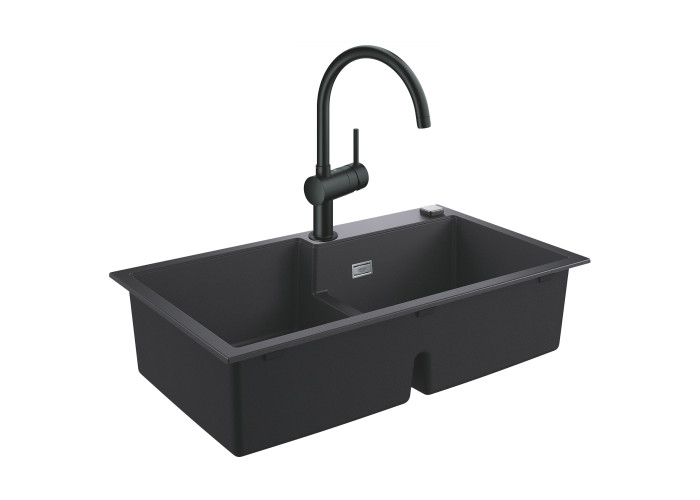 Набір Grohe мийка кухонна K500 31649AP0 + змішувач Minta 32917KS0 - готове рішення для кухні. Мийка виготовлена з кварцевого композиту, який складається з 80% кварцу і 20% акрилової смоли і затверджувача. Вона виконана з двома робочими чашами з переливом. Змішувач виготовлений з високоякісної латуні зі стильним матовим покриттям чорного кольору, виконаний в сучасному дизайні з поворотним трубкоподібним виливом.