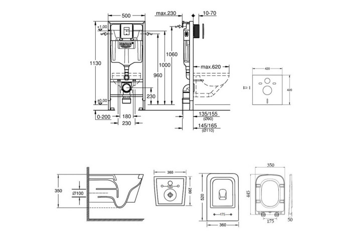 GROHE EasyConnect - зручне підмикання змивної панелі та спускного клапана. GROHE EcoJoy - водозберігаюча технологія. GROHE QuickFix - зручний монтаж. GROHE Safety - безпечність сталевих рам в інсталяційних системах. GROHE SpareFlush - додатковий об‘єм змиву. GROHE ToolFree - просте підмикання. GROHE VarioPort - під‘єднання шланга до водопостачання в чотирьох точках. GROHE Whisper - тиха робота виробів.