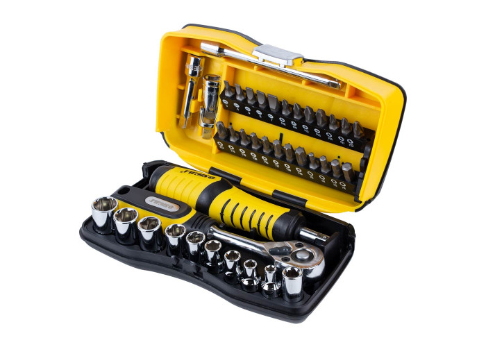 Набір насадок торцевих і біти 1/4 "39шт CrV Sigma (6003571) - виготовлений з CrV і призначений для монтажу і демонтажу різьбових з'єднань. Комплектація: насадки (9 шт.): 4, 5, 6, 7, 8, 9, 10 , 11, 12 мм; рукоятка з храповим механізмом і реверсом; подовжувачі (2 шт.): 55 мм, 100 мм; iарнір карданний; dороток отверточних; gластіковий кейс.
