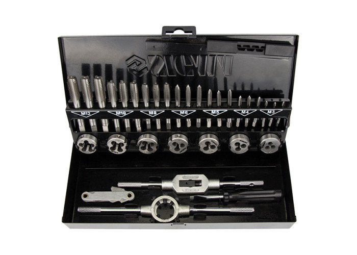 Набір плашок і мітчиків 32 предмети (металевий кейс) Sigma (1643191) призначений для нарізування внутрішньої та зовнішньої метричної різьби на металевих виробах, для калібрування і відновлення пошкоджених ділянок різьблення. При нарізанні, різьблення, попередньо, змащують консистентним мастилом. Особливості: рифлені поверхні на ручках власників для запобігання прослизання інструменту; зручний і міцний кейс для перенесення і зберігання; підходить для широкого діапазону матеріалів; плашки, завдяки високій жорсткості, дають можливість отримати різьблення високої якості; мітчики призначені для нарізування різьблення як в наскрізних, так і глухих отворів; квалітет - 6g; кут профілю різьби - 60º; збіг різьблення - для плашок: 2х2Р; для мітчиків: 5К; тип отворів - для мітчиків: глухі, наскрізні; стандарт - плашки DIN 233, мітчики DIN 352. Комплектація: плашки: М3х0.5, М4х0.7, М5х0.8, М6х1.0, М8Х1.25, М10х1.5, М12х1.75; мітчики: М3х0.5, М4х0.7, М5х0.8, М6х1.0, М8Х1.25, М10х1.5, М12х1.75; тримач для плашок - 1шт; трим