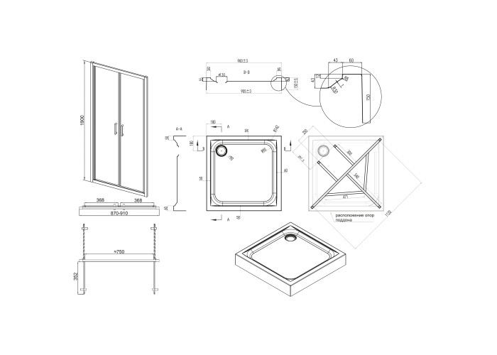 Попередньовстановлені скляні двері з профілем, ручки, набір ущільнювачів, розширювальні профілі, заглушки, комплект кріплень, піддон, сифон з випуском 40/50мм.