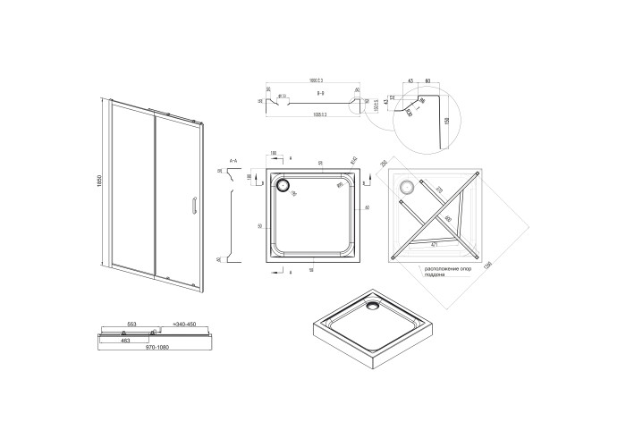 Глухе скло, скляні двері, розширювальні профілі, верхній профіль, нижній профіль, ручка, подвійні ролики, комплект кріплень, набір ущільнювачів, заглушки, піддон, сифон з випуском 40/50мм.