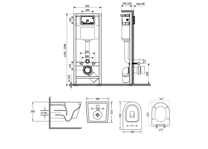 Унітаз, сидіння, інсталяція, панель змиву, звукоізоляційна прокладка, кріпильні деталі.