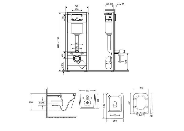 Унітаз, сидіння, інсталяція, панель змиву, звукоізоляційна прокладка, кріпильні деталі.