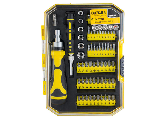 Набір викруток + біти 69 шт CrV (кейс) Sigma (4002541) призначений для монтажу і демонтажу шурупів, саморізів і гвинтів. Укомплектований ударостійкою викруткою з реверсивним механізмом і гумованою протислизькою рукояткою, викруткою для точних робіт з подовжувачем, торцевими головками, битами виготовленими з високоякісної хромованадіевой сталі. Компактний пластиковий кейс для зберігання і транспортування. Особливості: Crv сталь; двокомпонентна ручка. 69 предметів: 5/32"; викрутка з подовжувачем 75 мм; 30 біт 30 мм: SL1.0, 1.5, 2.0, 2.5, 3.0, 3.5, 4.0 мм; PH000, 00, 0, 1; PZ0, 1; Hex0. 7, 0.9, 1.3, 1.5, 2.0, 2.5, 3.0, 4.0; T4, T5, Т6, Т7, Т8, Т9, Т10, Т15, Т20. ¼"; викрутка з реверсом; 30 біт 25мм: SL3, 4, 5, 7 мм; PH0, 1x2, 2x2, 3; PZ0, 1x2, 2x2, 3; Hex3, 4, 5, 6 мм; T10, T15, T20, T25, T27, T30, T40; Square1, 2, 3 мм. 6 насадок: 5, 6, 7, 8, 10, 12 мм; перехідник 25 мм квадрат 1/4"- шестигранник 1/4" Hex.