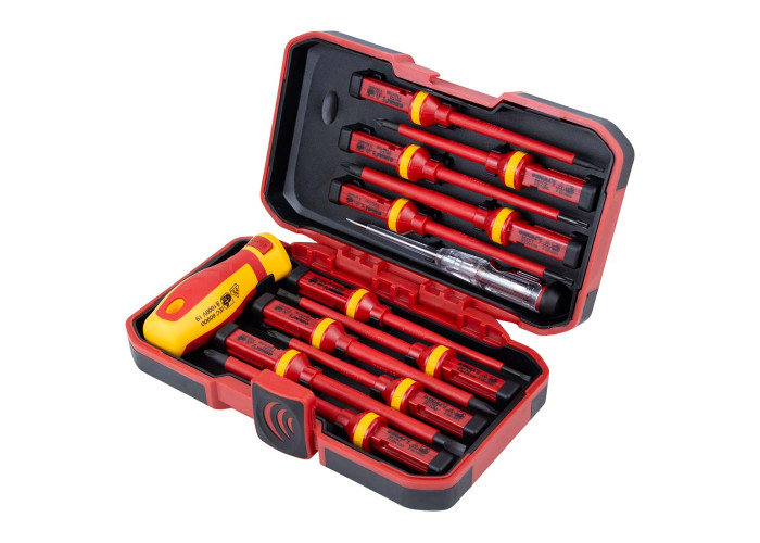 Набір викруток діелектричних 11шт + викрутка-індикатор 250В CrV (пласт кейс) Sigma (4008411) - для виконання електромонтажних робіт під напругою до 1000В. Робочі поверхні загартовані. Змінні стержні. Ергономічна двокомпонентна протиковзка рукоятка забезпечує додаток високого крутного моменту. Високоточний наконечник забезпечує надійну посадку в кріпленні. Характеристики CrV сталь; високовольтні (до 1000В). 12 предметів: SL 3.0 × 100 мм; SL 4.0 × 100 мм; SL 5.5 × 100 мм; SL 6.5 × 100 мм; PH 1 × 80 мм; PH 2 × 100 мм; PZ 1 × 80 мм; PZ 2 × 100 мм; TORX T10 × 100 мм; T15 × 100 мм; T20 × 100 мм; викрутка-індикатор SL 3.0 × 140 мм, 250 В.