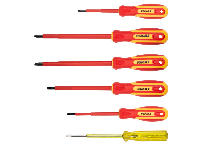 Набір викруток діелектричних 5 шт + фазомір 250 В CrV Sigma (4001071) - завдяки зручній формі рукояті і оптимально підібраному розміру, викрутки добре лежать в руці і не прослизають в момент прикладення зусилля. Жало викруток покрито ізоляційним матеріалом. У комплект входить 5 викруток для роботи з високовольтними мережами та 1 низьковольтний тестер для побутових мереж. Особливості: Crv сталь; високовольтні (до 1000 В). 6 предметів: PH1x80 мм, РН2х150 мм; SL6x150 мм, SL5х125 мм, SL4х100 мм; фазомір SL4х75 мм, 250 В. Купити набір викруток діелектричних Sigma Ви можете, оформивши замовлення в нашому інтернет-магазині за допомогою простої форми, доставка здійснюється по всій Україні. Якщо у Вас виникли питання, Ви можете зателефонувати за вказаними номерами телефонів або замовити зворотний дзвінок. Фахівці нашого інтернет-магазину нададуть Вам докладні консультації та допоможуть зробити правильний вибір.